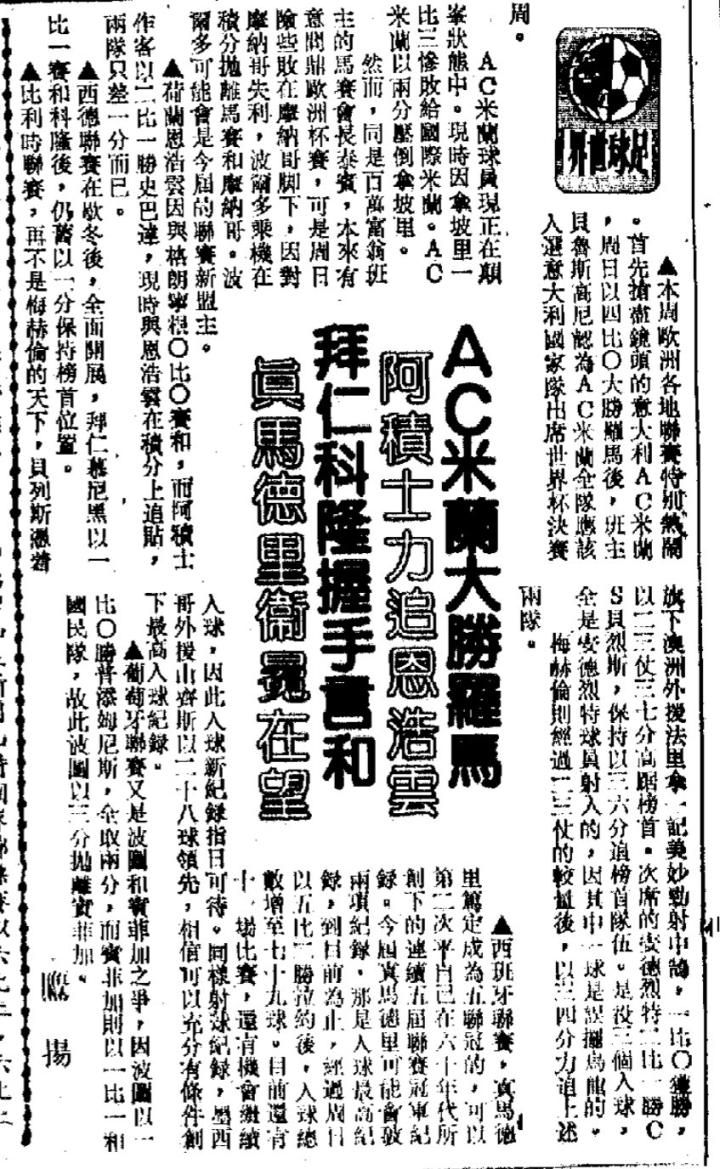 历史上的今天:AC米兰大胜罗马,阿贾克斯力追埃因霍温,拜仁科隆握手言和,皇家马德里卫冕在望 1990年2月27日,香港大公报 AC米兰大胜罗马,阿积士力追恩浩云,拜仁科隆握手言和,真马德里卫冕在望 本周欧洲各地联赛特别热闹。首先抢尽镜头的意大利AC米兰,周日以四比〇大胜罗马后,班主贝鲁斯高尼认为AC米兰全队应该入选意大利国家队出席世界杯决赛周。 AC米兰球员现正在巅峰状态中。现时因拿坡里一比三惨败给国际米兰。AC米兰以两分压倒拿坡里。 然而,同是百万富翁班主的马赛会长泰宝,本来有意问鼎欧洲杯赛,可是周日险些败在摩纳哥脚下,因对摩纳哥失利,波尔多乘机在积分榜抛离马赛和摩纳哥。波尔多可能会是今届的联赛新盟主。 荷兰恩浩云因与格郎宁根〇比〇赛和,而阿积士作客以二比一胜史巴达,现时与恩浩云在积分上追贴,两队只差一分而已。 西德联赛在歇冬后,全面开展,拜仁慕尼黑以一比一赛和科隆后,仍旧以一分保持榜首位置。 比利时联赛,再不是梅赫伦的天下,贝列斯凭着旗下澳洲外援法里拿一记美妙劲射中鹄,一比〇获胜,以二三仗三七分高踞榜首。次席的安德列特二比一胜CS贝列特,保持以三六分追榜首队伍。是役三个入球,全是安德烈特球员射入的,因其中一球是误摆乌龙的。 梅赫伦经过二三仗的较量后,以三四分力追上述两队。 西班牙联赛,真马德里笃定成为五连冠的,可以第二次平自己在六十年代所创下的连续五届联赛冠军纪录。今届真马德里可能会破两项纪录。那是入球最高纪录,到目前为止,经过周日以五比二胜拉约后,入球总数增至七十九球。目前还有十一场比赛,还有机会继续入球,因此入球新记录指日可待。同样射球记录,墨西哥外援山齐斯以二十八球领先,相信可以充分有条件创下最高入球纪录。 葡萄牙联赛又是波图和宝菲加之争,因波图以一比〇胜普添姆尼斯,全取两分,而宝菲加则以一比一和国民队,故此波图以三分抛离宝菲加。