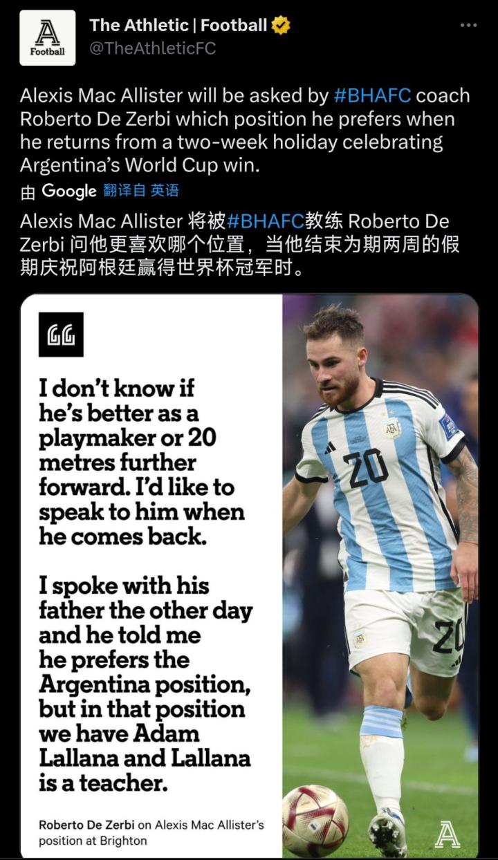 当麦卡利斯特从世界杯回来后,德泽尔比曾询问他最喜欢的场上角色是什么。“我不知道他作为球队的组织者或者说是在球场更靠前20米的区域踢球能不能有更好表现。等他结束世界杯的休假后,我会跟他聊聊。我后来跟他的父亲谈过,他告诉我麦卡利斯特更喜欢在阿根廷踢的位置,但在那里我们有拉拉纳了,而且拉拉纳是一位导师般的存在。”