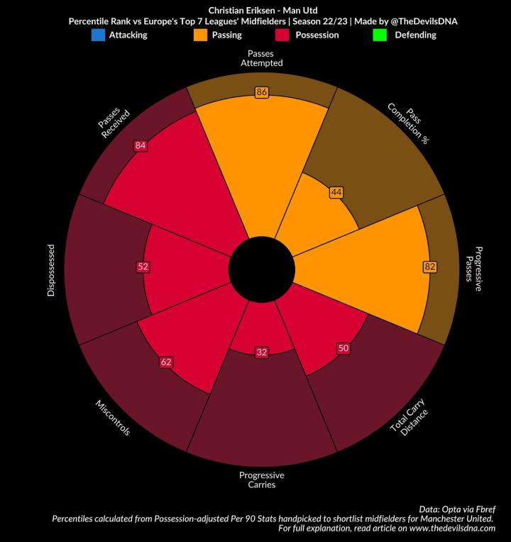 根据本文的评分公式,埃里克森的适配度为74%,说明基于滕哈赫的战术需求,这是个不错但不算特别好的人选。这个结果与曼联比赛的直观感受基本一致,而相关数据能说明埃里克森在哪些方面仍有不足。埃里克森在传球次数、接球次数和推进传球等方面都表现得很棒,传球到位率、控球和带球等方面都在平均水平。