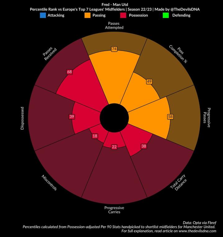 弗雷德的适配度为52%,他的优缺点在披萨图中也体现得非常明显。巴西人会积极地参与球队的进攻全程,推进传球也不错,但保有球权和带球方面的数据并不好看。弗雷德的“控球失误”仅优于18%的中场,这也正是球迷对于他在进攻发起阶段整体表现感到失望的主要原因。如果你需要一位能在重压之下接球的屈原,还是不要指望弗雷德了,他有控球失误的倾向。我们认为如果让弗雷德远离进攻发起任务,主要负责后续进攻阶段的工作,他的发挥会好得多(就像在朗尼克麾下的角色,而是滕哈赫入主后让卡塞米罗或麦克托米奈拖后那样)。