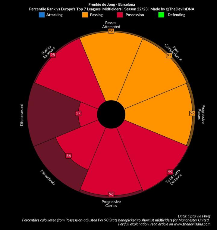 如果读者在阅读前文的战术角色和相关数据时没有哪怕一次想起弗伦基·德容,那我们为本文所做的准备工作就非常糟糕了。因为他就是完美符合曼联需求的球员,这也是滕哈赫去年夏天苦追他的重要原因。虽然曼联签下德容的可能性并不高,但考虑到曼联不久前才追求过他,而且主教练是滕哈赫,我们仍然把德容放入了候选列表。弗伦基可谓理想的卡塞米罗搭档,不夸张地说,如果能得到他,曼联的大部分问题都可以解决,球队也能组建起全欧最强中场之一。