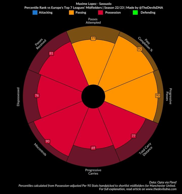 优点:洛佩斯通常都会出任双后腰之一(起初与洛卡特利搭档,现在则是和弗拉泰西搭档),有球能力非常出色。他是顶级的技术型中场,能保质保量地完成推进带球和推进传球重任,十分擅长在重压之下接应本方的后场出球,并通过带球或传球破解对方逼抢。如下面的披萨图所示,洛佩斯在我们选出的8项数据上都表现得非常出色,有球方面也没有弱点。萨索洛上赛季的联赛排名仅为第11名,本赛季也仍是积分榜后半区,让他的数据显得更为亮眼了。我们大可以相信如果让他加盟一支更好的球队,相关数据还能再上一个台阶。虽然比赛中的主要工作是进攻发起,洛佩斯在组织串联以及创造机会等方面的意识也非常棒,如果条件允许,你也能看到他前插进攻或拉边支援队友。主教练也偶尔会尝试让洛佩斯客串攻击型中场或站位靠前的中前卫,实际效果也不错。