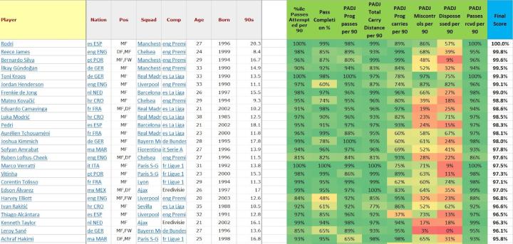 从结果来看,最前列的球员是罗德里、B席、京多安和克罗斯,说明我们的方向没错。里斯·詹姆斯和其他一些并不是中场的球员因为过去曾踢过中场而被fbref网站标记成了中场,所以也混入了我们的数据库里。