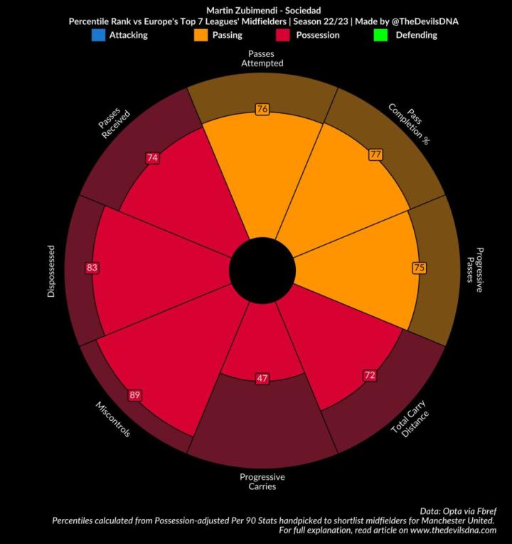 优点:苏维门迪出任球队菱形中场的拖后位置,是一位相当可靠的防守型中场,会揽下球队的大部分进攻发起和推进任务,已经跻身西甲最佳之列。他的对抗效率非常高,放眼整个西甲联赛,只有古德利的争顶和抢断成功率都比他更高。高超的位置感和盯人能力也使得苏维门迪成为顶级中场屏障和转换防守人,同时他的推进传球能力和保有球权能力都可以令人放心。他很擅长掌控比赛节奏,能在皇家社会的传控体系中把控进攻速度,这点正好契合滕哈赫的战术理想。以单后腰所需的球权推进、节奏掌控、转换防守和进攻发起跑动等标准评价,苏维门迪无疑是顶级球员。