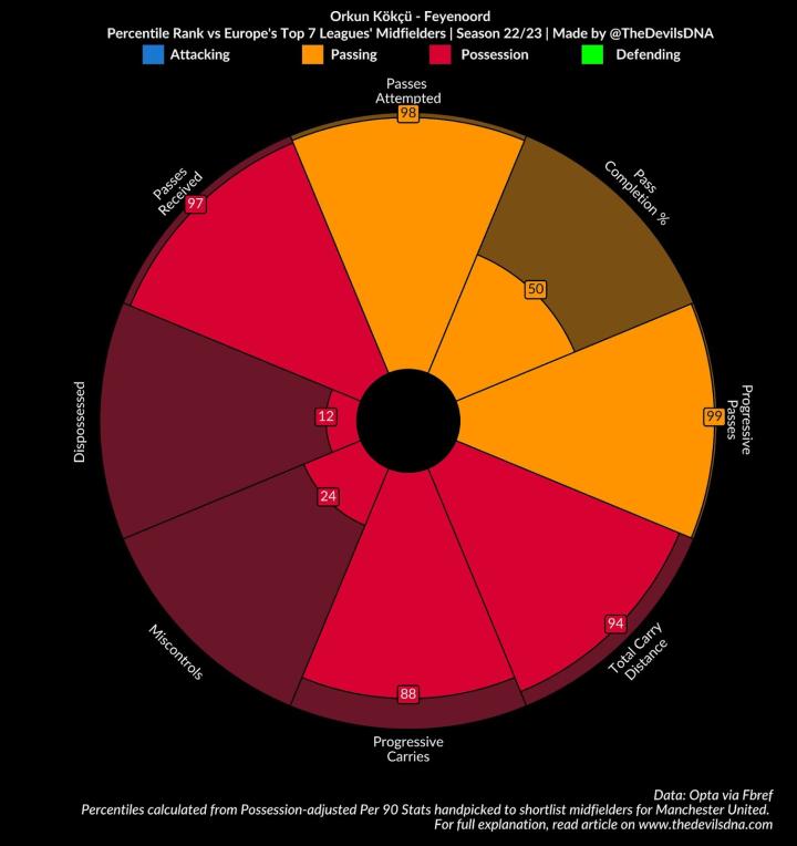 缺点:如披萨图所示,他仅有的3项低于平均的数据都和保有球权有关,主要原因之一是他会在场上出任更靠前一些的角色。单是本赛季,科克屈就有9场比赛出任边前卫或10号位。目前的科克屈出任单后腰时还不算可靠,但如果和卡塞米罗搭档,这对组合的实际效果应该没问题,只是卡塞米罗缺阵时让他一个人出任6号位会带来一些隐患。此外,尽管他破逼抢的表现不错,也仍有提升空间。承受巨大压力时他还是会选择直接长传或直接丢失球权,所以比起候选列表上的其他人在保有球权方面处于劣势。