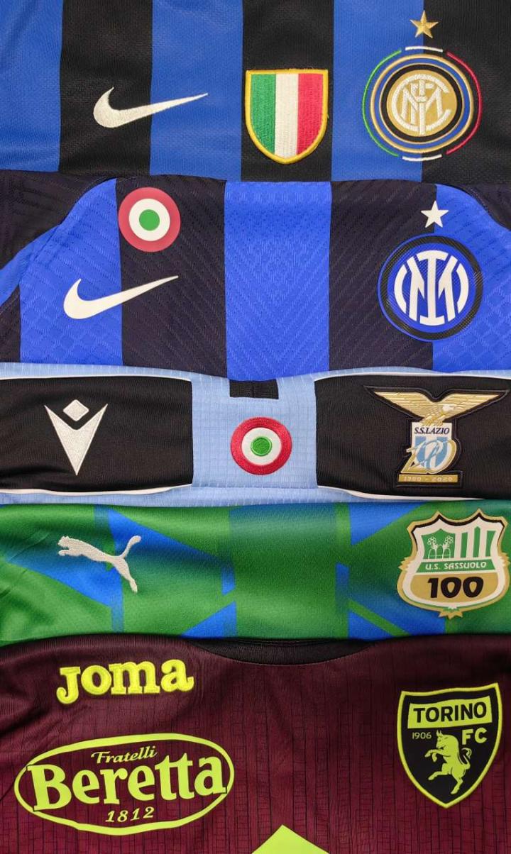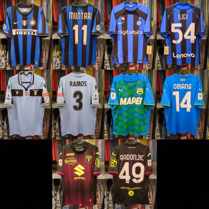 【2023年2月球衣收藏小结】 近期终于是搬完家了,于是又开始了给球衣拍照的工作,以后大概率不会拍照风格和背景了。正所谓新年新气象,今年收藏球衣打算更加理性更有针对性,主线依旧是收藏国米耐克时期每款更衣室球衣,支线还是收集意大利球队球衣。下面就分享一下2月的球衣收藏吧: 第一件是萨索洛2020-2021赛季第二客场落场球衣,20-21赛季意大利杯1/8决赛萨索洛0-2斯帕尔场次使用。球衣的主人是14号赤道几内亚中场奥比昂,曾在桑普和西汉姆联效力多年。 这件二客球衣整个赛季联赛仅穿过3场,意大利杯穿过1场,算是一件不常见的球衣了。由于这个赛季恰逢萨索洛建队百年,球队的队徽也换成了百年特别版,之前收过一件球队百年赛季的帕尔马,也有类似设计。 第二件是小国际本赛季主场球员版球衣,印了54号,保加利亚04年中场小将伊利耶夫,国米预备队的中场王牌,本赛季曾在青年欧冠小组赛上演大四喜,虽然还没进过一线队正式比赛大名单,但已经入选保加利亚成年国家队,友谊赛和欧国联出场过4次。虽然还没入选过一线队大名单,但在冬歇期国米6-1格兹拉联的友谊赛中,伊利耶夫身披54号替补登场,参照那场比赛的印法没有印臂章。 第三件是拉齐奥2019-2020赛季120周年特别版球衣,后半赛季作为主场球衣使用,并在接下来的2020-2021赛季作为欧冠主场球衣使用。号码是3号意大利归化国脚中后卫路易斯-费利佩,现效力于皇家贝蒂斯。为了让球衣元素更加丰富,又加印了红箭高铁广告臂章。 这件拉齐奥虽然没有胸前广告,球衣的设计也没有使用Macron最喜欢使用的暗纹和图案元素,但这个与百年赛季类似的120周年变形队徽和印号确实漂亮。比起更常见的接下来赛季的欧冠盒装版本,19-20赛季的120周年球衣多了意大利杯卫冕靶,加上价格还不错,因此收了这件。 第四件是小国际2009-2010三冠王赛季主场更衣室球衣,11号加纳中场悍将蒙塔里,共在球队效力4个赛季,出场97次,打进8球。 每当回忆起那个辉煌的09-10赛季,当时球队里的每一个人感觉都那么熟悉,那是一个老男孩们站上欧洲和世界之巅的故事。当年意气风发的“狂人”穆里尼奥已经步入花甲之年,而当年见证了主队走向巅峰的高中生也即将三十而立。有时候很羡慕现在的学生,有这么多方便的途径购买球衣,也有很多志同道合的人交流球衣,不用在多年以后才有机会收到学生时代看球的球衣。 或许冥冥之中自有天意,队徽旁的意大利国旗三色环绕队徽,堪称是球队历史上最经典的设计之一,也让这件很传统的蓝黑间条衫成为很多内拉最难忘是一件球衣。 第五件是都灵本赛季二客更衣室球衣,49号塞尔维亚前锋拉多尼奇。都灵在本赛季意大利杯第一轮3-0淘汰巴勒莫和第二轮4-0淘汰奇塔代拉的两场比赛使用了该款球衣,拉多尼奇两场比赛均有进球。 这件球衣虽然卖家标注更衣室,但好像和市售也没什么区别,大多数意大利球队球衣都不区分版本,看到这件价格要比官网市售球衣便宜就果断入手了,本赛季意甲其他球队想收的几款球衣基本都已经收到了。 这件球衣最大的亮点在于队徽、JOMA的logo、衣领的slogan和四处广告都是荧光黄色,只可惜看过一篇报道说意甲不允许使用荧光色的号码,这一点还是很遗憾的,就好像上赛季小国际主场球衣没能使用金色字一样遗憾。 收到这件都灵后,手里已经有20支意大利球队的球衣了,本赛季还考虑入手蒙扎和博洛尼亚的球衣。意甲球衣五花八门,20支球队共使用了13个不同的品牌,其实很多球衣的设计都是可圈可点的,也希望通过我的帖子能让更多人了解意甲,关注意甲球衣。