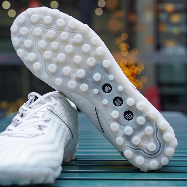 现钰2已闪亮登场,让我们开启科技密码看看都有些什么~鞋面依旧延续了上一款舒适全袋鼠皮让双脚享受全方位的舒适包裹,更加稳健传、停、控球搭配镭射LOGO,高颜值受人喜爱。新升级TF大底采用TUFF RB橡胶鞋底,畅跑无忧外加半掌碳板抗扭转,给予足弓更好的支撑。“䨻”轻弹科技,高回弹缓震,急速启动。