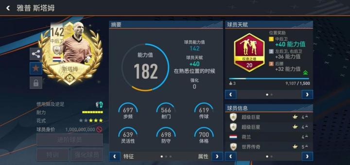 游戏中,斯塔姆推出的这张世界杯传奇版本配备了叹息之墙天赋,基础能力值更是达到了142实战中,斯塔姆稳定的站位防守能力让他堪称是对手前锋的噩梦。每当对手持球进攻推进到本方禁区前沿时,斯塔姆会马上贴身进行干扰破坏,总能打乱对手的进攻节奏。