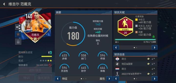 游戏中,范戴克在世界杯活动期间推出了一张基础能力值140的世界杯明星版本,天赋方面他配备了叹息之墙,实战表现也很不错。首先,范戴克高大的身材让后场的防空能力大大提升,另外,他的正向冲抢断球成功率非常高,具备出色的上抢能力。