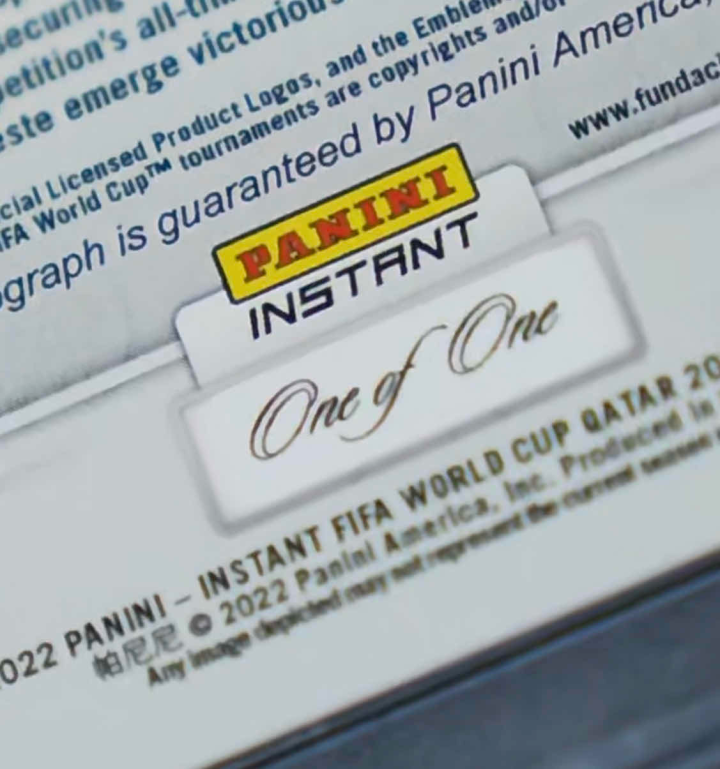 这张卡是Panini 为了纪念2022年世界杯而推出的FIFA World Cup Instant系列中阿根廷队夺冠后梅西捧杯庆祝时刻的限量一编签字卡。