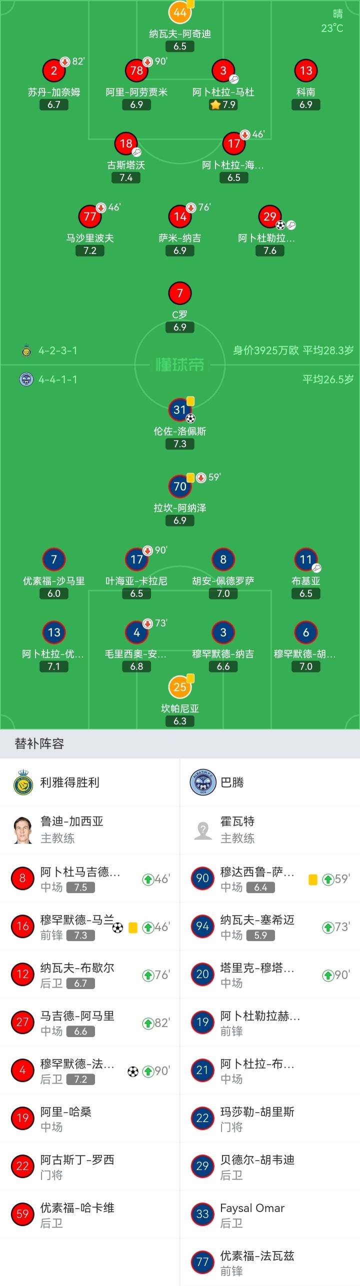 利雅得胜利首发:44-纳瓦夫-阿奇迪、2-苏丹-加奈姆(82'27-马吉德-阿马里)、3-阿卜杜拉-马杜、78-阿里-阿劳贾米(90'4-穆罕默德-法蒂勒)、13-科南、17-阿卜杜拉-海巴里(46'8-阿卜杜马吉德-苏莱希姆)、18-古斯塔沃、14-萨米-纳吉(76'12-纳瓦夫-布歇尔)、77-马沙里波夫(46'16-穆罕默德-马兰)、29-阿卜杜勒拉赫曼-加里卜、7-C罗