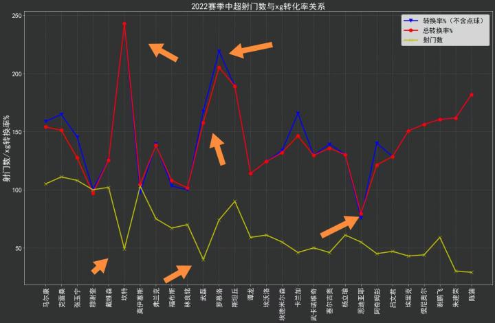 本图中我加入了射门次数及转化率的数据,配合图一能更加清楚地看到球员表现。可以看到转化率与射门次数存在一定的负相关,毕竟虽然射门越多进球可能越大,但是在量级上一般球员进球的增长率远远追不上射门次数的增长幅度(射门数很少的球员除外)。