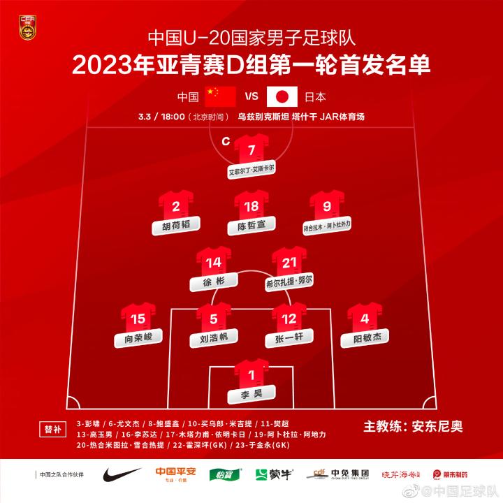 比赛中,U20国足主帅安东尼奥安排艾菲尔丁担任场上队长,作为单箭头,顶在最前方,李昊司职门将,向荣峻、刘浩帆、张一轩、阳敏杰组成后防线,徐彬、希尔扎提-努尔组成双后腰,胡荷韬、陈哲宣、拜合拉木-阿卜杜外力坐镇中场。