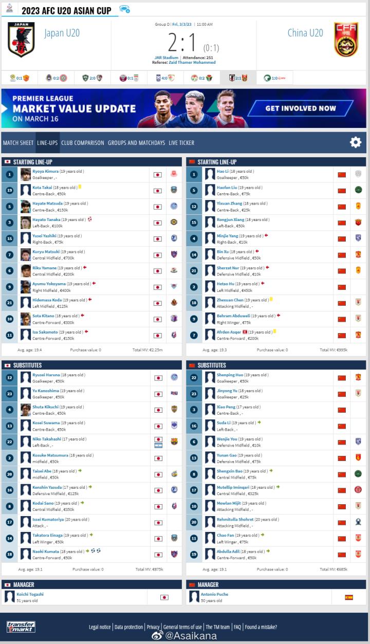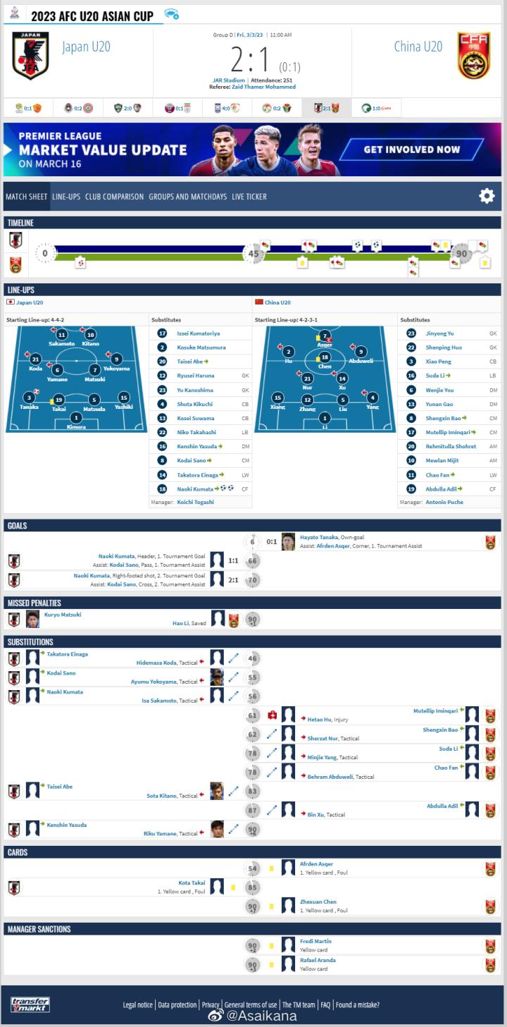 2023亚足联U20亚洲杯 小组赛 日本2-1中国 比赛报告