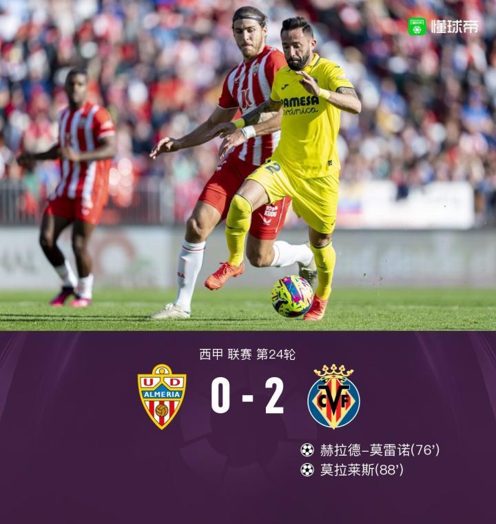 阿尔梅里亚0-2黄潜,赫拉德-莫雷诺建功,丘库埃泽助攻双响