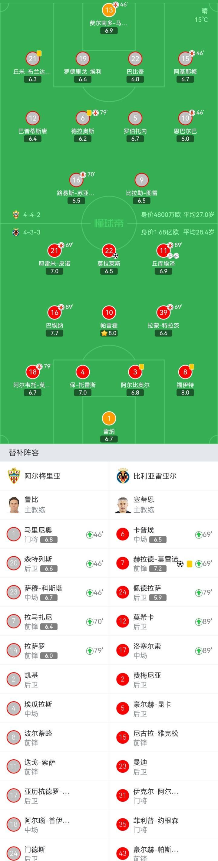比利亚雷亚尔首发:1-雷纳、18-阿尔韦托-莫雷诺(79'24-佩德拉萨)、4-保-托雷斯、3-阿尔比奥尔、8-福伊特、16-巴埃纳(89'17-洛塞尔索)、10-帕雷霍、39-拉蒙-特拉茨(69'6-卡普埃)、21-耶雷米-皮诺(69'7-赫拉德-莫雷诺)、22-莫拉莱斯、11-丘库埃泽(89'12-莫希卡)