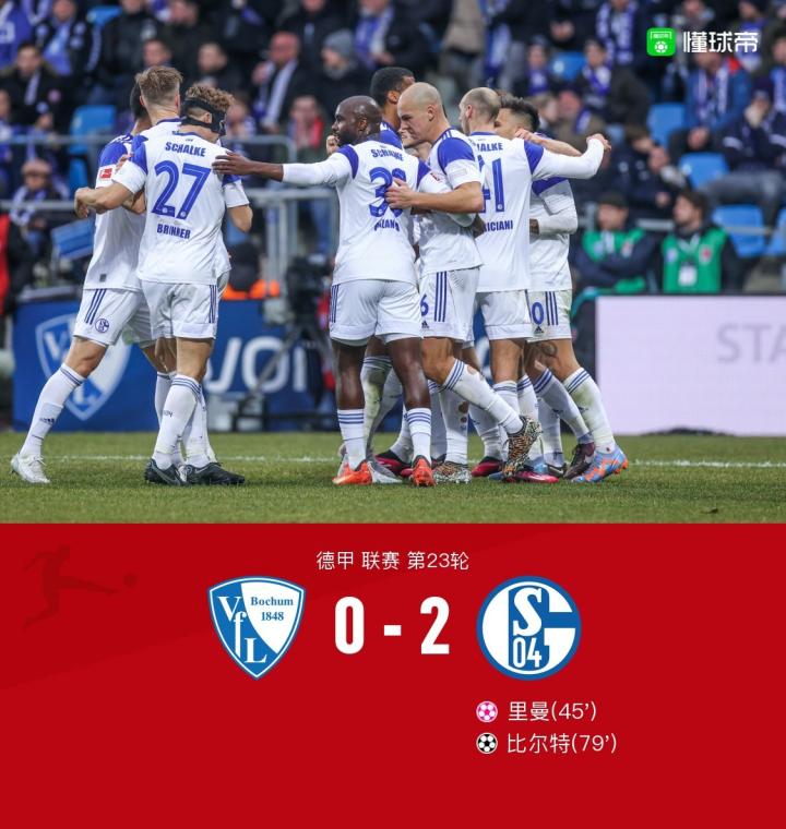 北京时间3月4日22:30,德甲第23轮,波鸿对阵沙尔克04。上半场里曼自摆乌龙,易边再战,比尔特锁定胜局。最终全场比赛结束,波鸿0-2沙尔克04。沙尔克取得两连胜摆脱垫底,同时送波鸿排名降至榜末。