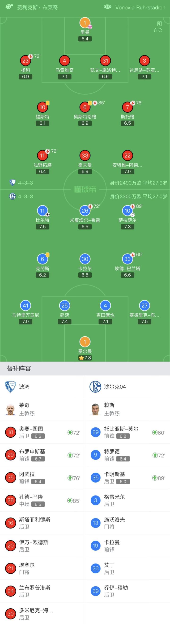 沙尔克04首发:1-费尔曼、41-马特里奇亚尼、25-延茨、4-吉田麻也、27-塞德里克-布伦内尔、33-埃德-巴兰塔(60'29-托比亚斯-莫尔)、30-卡拉尔、11-比尔特、6-克劳斯、10-萨拉萨尔(89'33-卡明斯基)、26-米夏埃尔-弗雷(72'9-特罗德)