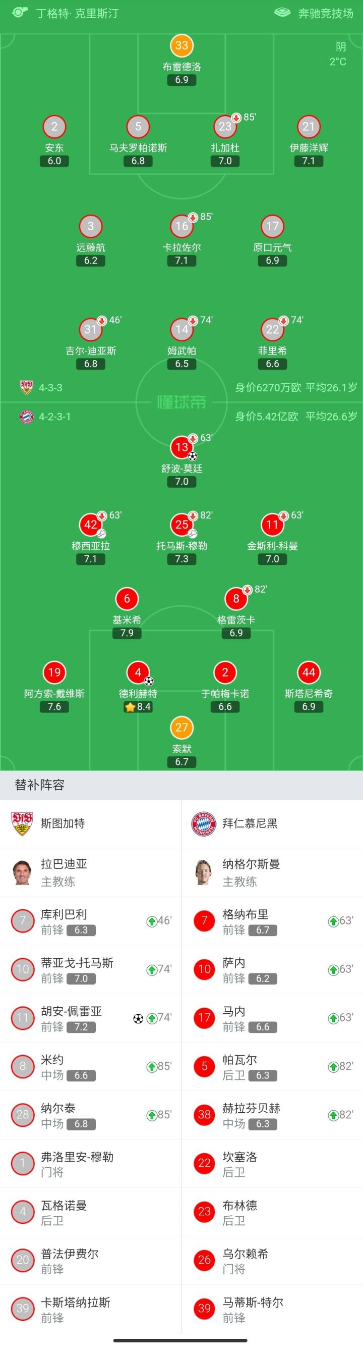 斯图加特首发:33-布雷德洛、2-安东、5-马夫罗帕诺斯、23-扎加杜(85′28-纳尔泰)、21-伊藤洋辉、3-远藤航、17-原口元气、16-卡拉佐尔(85′8-米约)、22-菲里希(74′10-蒂亚戈-托马斯)、14-姆武帕(74′11-胡安-佩雷亚)、31-吉尔-迪亚斯(46′7-库利巴利)