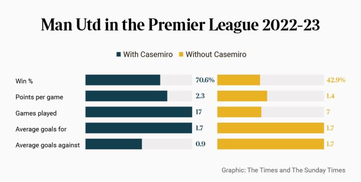 本赛季至今,卡塞米罗的存在与否对曼联的比赛胜率产生了很大影响。数据统计显示,在卡塞米罗登场的情况下,曼联本赛季至今的英超胜率达到70.6%;而在缺少了卡塞米罗的情况下,这一数字只有42.9%。除此之外,曼联的场均丢球数也因卡塞米罗是否在场而发生了较大变化。