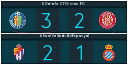 西甲第24轮继续,赫塔费3-2赫罗纳,巴拉多利德2-1西班牙人,两支排名靠后的球队取胜。