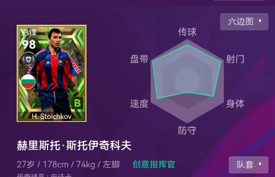 保加利亚的“霹雳火”、巴萨梦一功勋、金球奖得主——斯托伊奇科夫,在国服可以达到98分的满评。