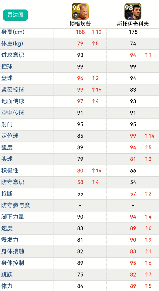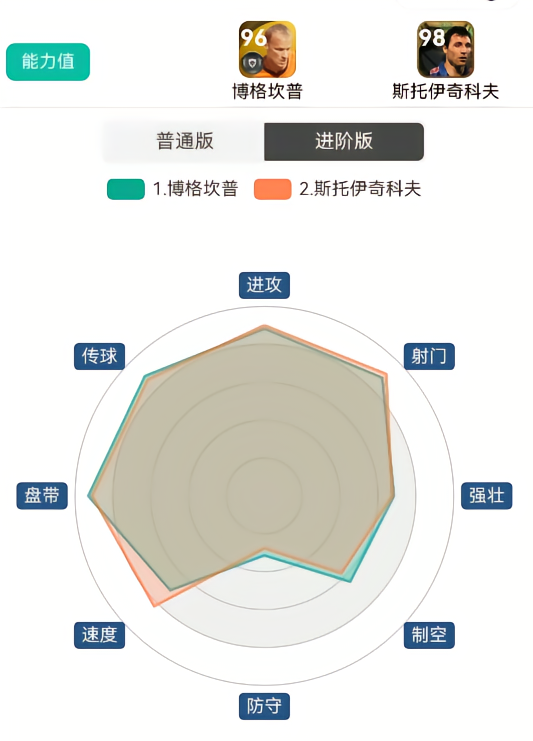 同为首次推出的史诗卡,斯托伊奇科夫和B费史诗卡很是相似。二者都是技术型球员,且均为创意指挥官风格。具体数据上,B费的双传更出色,紧密控球顶尖,体力更是拉满。而斯托伊奇科夫则是在盘控上更为出色,射门、定位球、双速、身体等数据更好。综合来看,二者实用性差不多,但斯托伊奇科夫要略胜一筹。