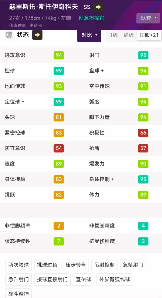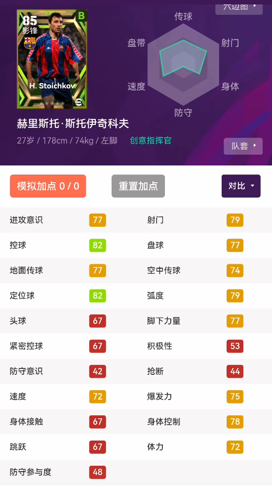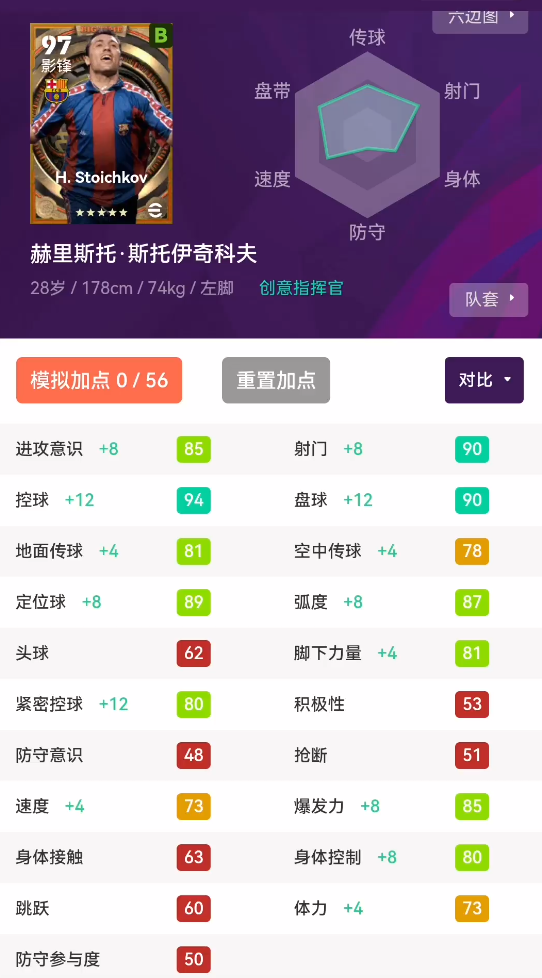 基础能力:可以看到,斯托伊奇科夫作为影锋球员,关键数据还是很出色的。控球拉满,双传出色,射门95,定位球是天花板级别。作为影锋,他手感出色,进攻推进不在话下,且还有一脚射门功夫。