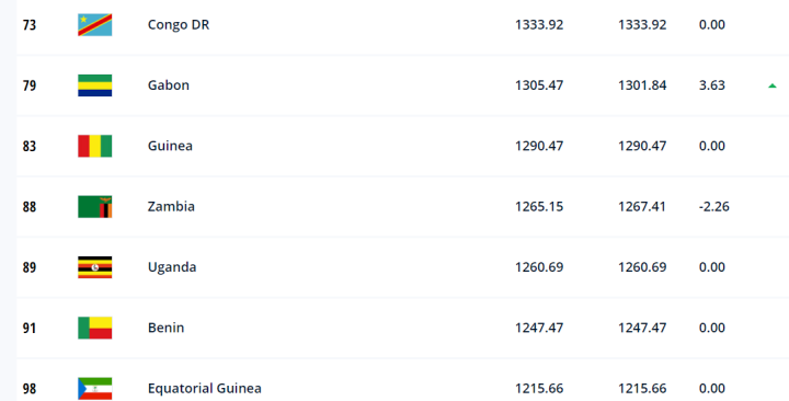 目前,三支非洲的几内亚队的国际足联国家队排名均在中国队(80位)之后。位次最高的是几内亚国家队,排名第83。其次是赤道几内亚,排名第98位。最低的是几内亚比绍,目前国际足联排名第118位。