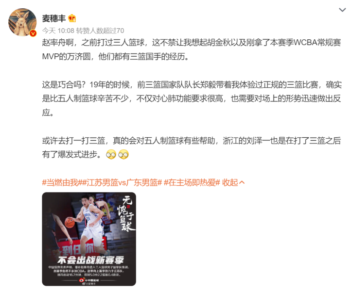 胡金秋、刘泽一和女篮的MVP万济圆都有三篮国家队经历,他们回到五人制篮球也都有了爆发式进步,看来麦穗丰说得是对的。