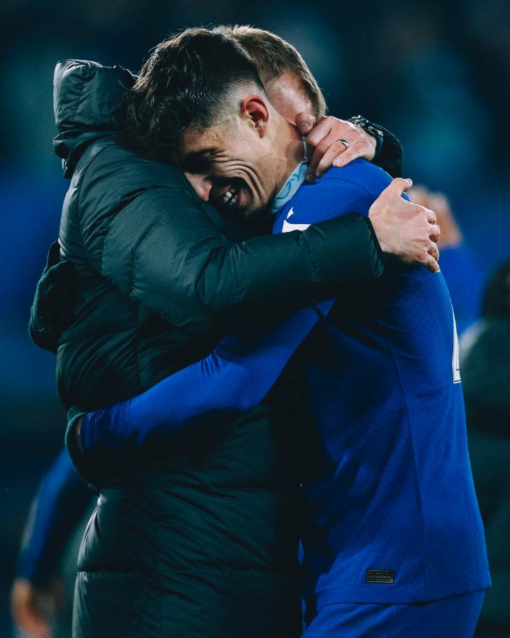 波特赛后与获胜功臣哈弗茨、奇尔韦尔和凯帕紧紧相拥...