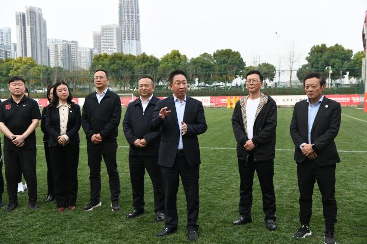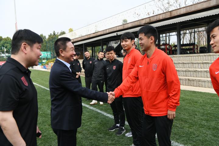 成都蓉城足球俱乐部常务副总经理姚夏向任志能董事长一行介绍了球队本阶段春训的成果以及球队的人员情况,任志能董事长在现场一一与教练员、球员和工作人员握手,向大家表示了亲切的慰问,同时欢迎新球员的到来。