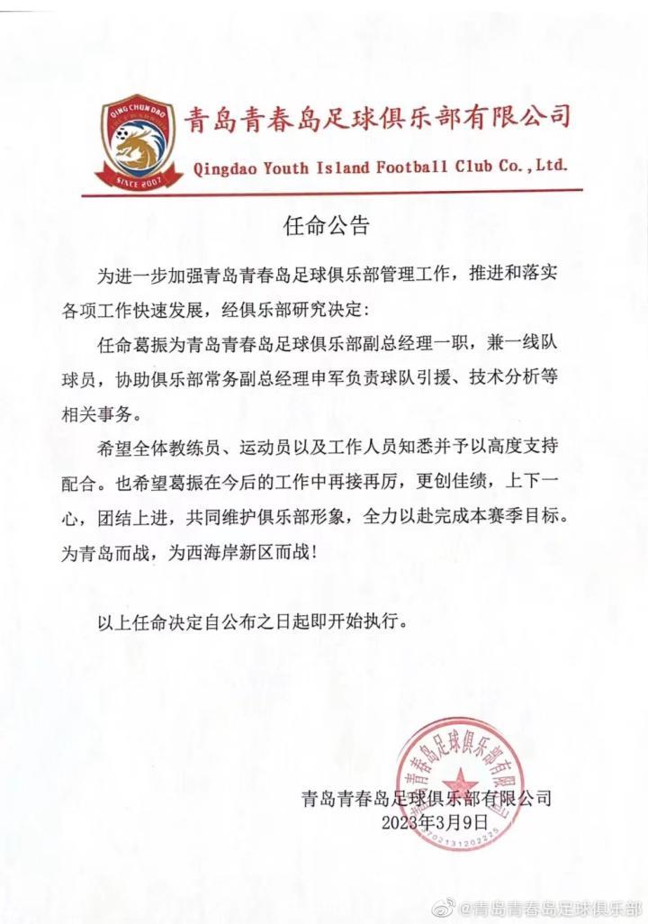 3月9日,此前一天刚经中国足协公告,由青岛青春岛更名而来的青岛西海岸足球俱乐部,发布了一则任命公告,任命葛振为俱乐部副总经理一职,兼一线队球员,协助俱乐部常务副总经理申军负责球队引援、技术分析等相关事务。这意味着完成更名后的这支中甲二年级生,正在进一步做好各项工作,备战新赛季。
