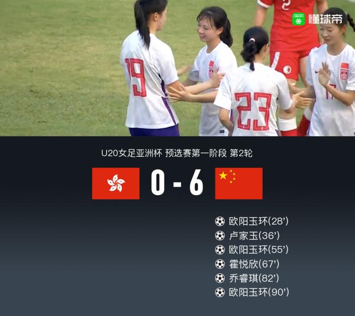 北京时间3月10日17:00,U20女足亚洲杯预选赛继续进行,中国香港女足U20对阵中国女足U20。上半场,中国女足U20开场后就持续压制对方,邹梦瑶、夏乐骄制造威胁,霍悦欣射门被扑后欧阳玉环补射打破僵局,卢家玉单刀破门再下一城;下半场,欧阳玉环再次破门,霍悦欣、乔睿琪建功,最后时刻欧阳玉环完成帽子戏法!最终中国6-0大胜中国香港。