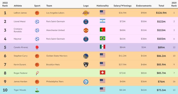 美国媒体评2022年运动员收入排行:勒布朗-詹姆斯力压梅罗