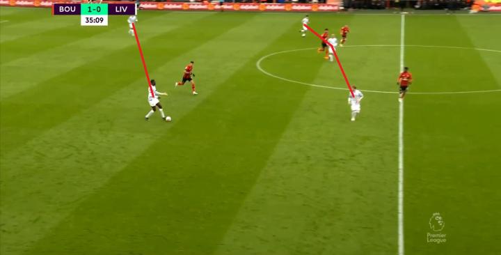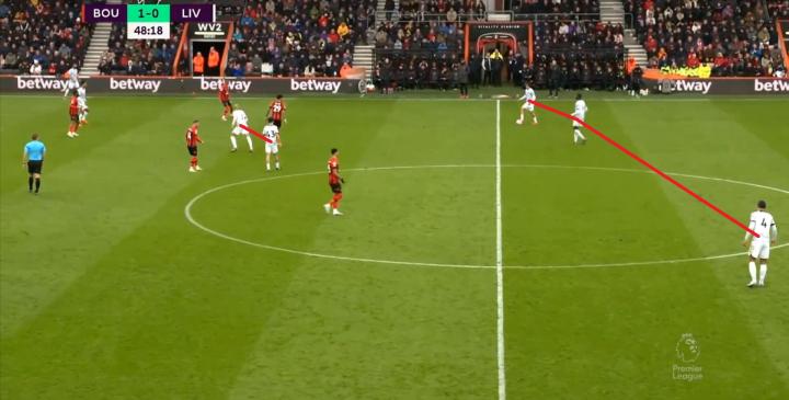 赛季前半程,打击阿诺德是利物浦的对手最容易想到的进攻办法,但在这套战术体系下,打击一个本来就要在进攻端多发挥,本来就要留出身后空间的球员是意义不大的,就像这场比赛的伯恩茅斯,左前卫安东尼并没有几次单打阿诺德的表现,更多的是得球之后尽快打回中路,让比林、索兰克等人去消耗利物浦的后场,用他们的对抗和瓦塔拉在弱侧的穿插来打击范戴克。