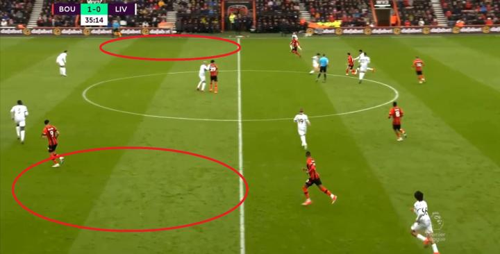 结果科纳特和前场连接失败,伯恩茅斯直接形成就地反击,在定格画面当中,我们可以清晰看到利物浦当时的薄弱区域: