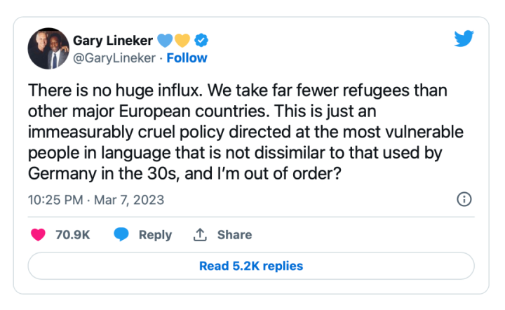 不过就在两天前的周五,BBC宣布将莱因克尔从《比赛日》中拿下。原因是莱因克尔在其社交媒体上抨击了英国最新的难民限制政策,破坏了媒体人在个人社交媒体上也应该保持中立态度的原则。
