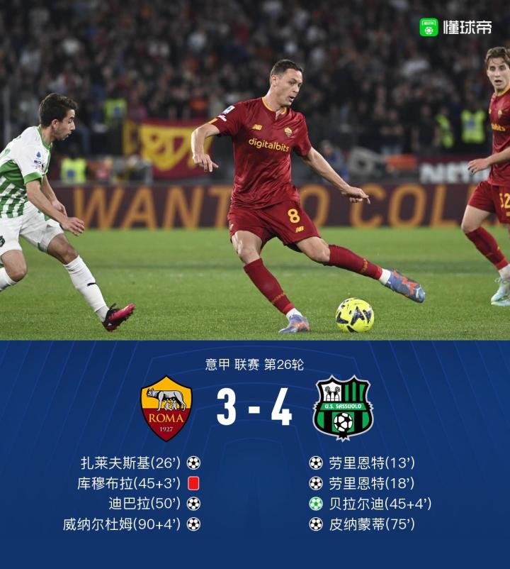 【十人罗马3-4萨索洛,迪巴拉替补破门,威纳尔杜姆挑射建功】