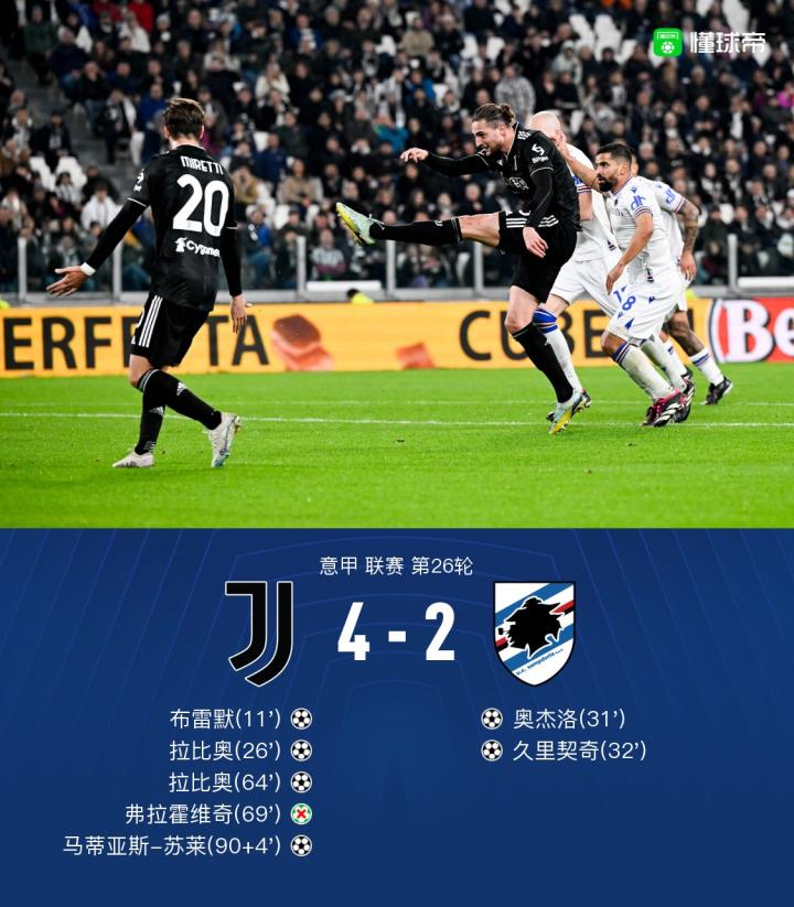 【尤文4-2桑普距欧战区4分,拉比奥双响+制胜,弗拉霍维奇失点】