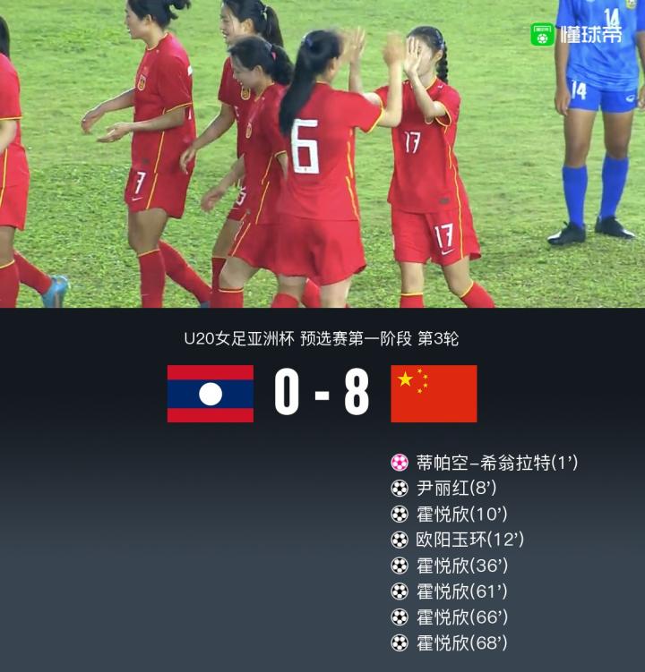 【U20中国女足8-0老挝,霍悦欣五子登科,欧阳玉环、尹丽红破门】