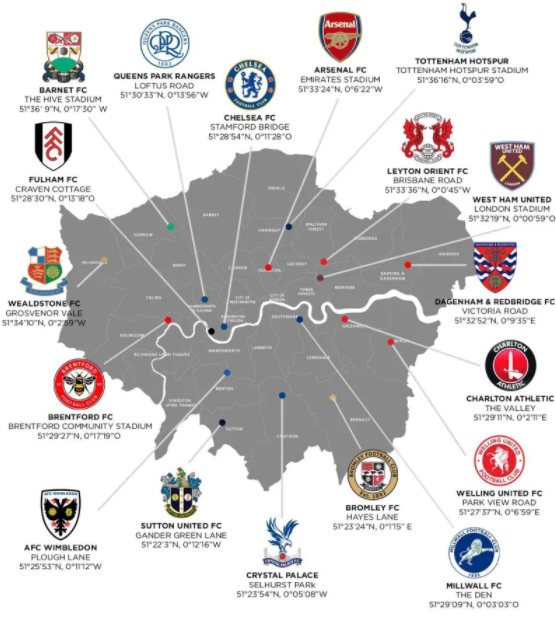 像切尔西这样以社区命名的情况在当地最为普遍,另外92家伦敦俱乐部中的有13家都使用当地社区的名字。