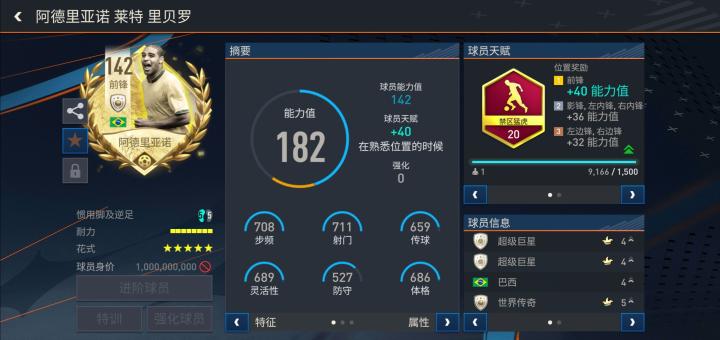 游戏中,阿德里亚诺推出的这张2022FIFA世界杯传奇版本配备了禁区猛虎天赋,基础能力值同样达到了142。