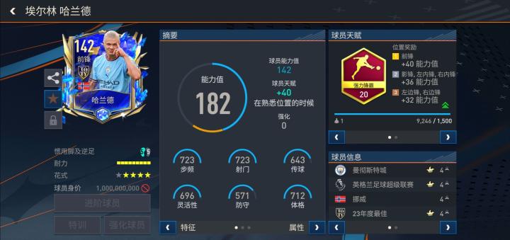 游戏中,哈兰德推出的这张年度最佳第十二人版本配备了强力锋霸天赋,基础能力值更是达到了142。