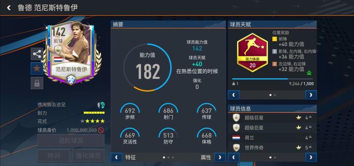 游戏中,范巴斯滕推出的这张2022FIFA世界杯传奇版本配备了强力锋霸天赋,基础能力值更是达到了142。