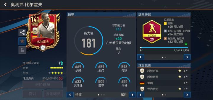游戏中,比尔霍夫推出的这张春节至尊限定传奇球员版本配备了禁区猛虎天赋,基础能力值达到了141。