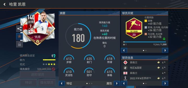 游戏中,凯恩推出的这张2022FIFA明星球员版本配备了强力锋霸天赋,基础能力值达到了140。
