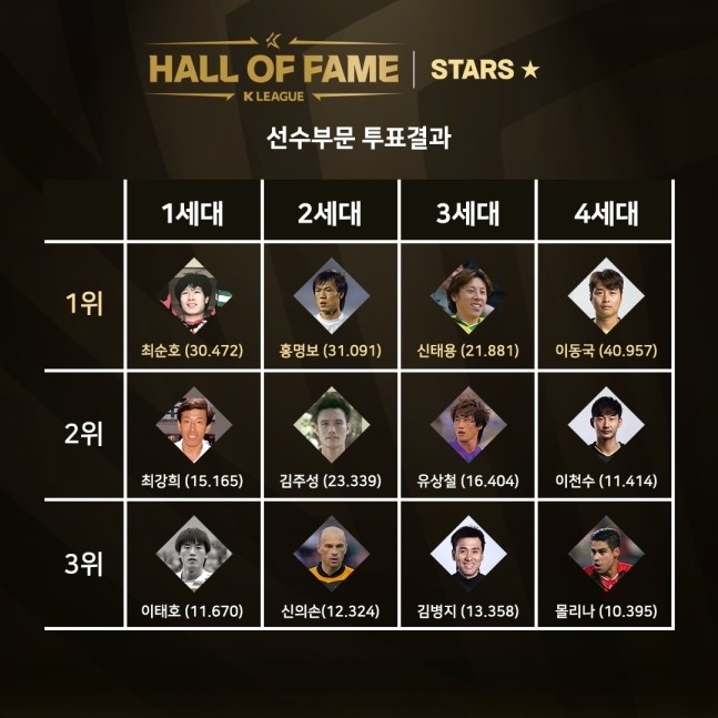 首批入选者为4位前球员(K联赛40周年每10年的票数最高者)、1位教练和1位杰出贡献者。他们是: