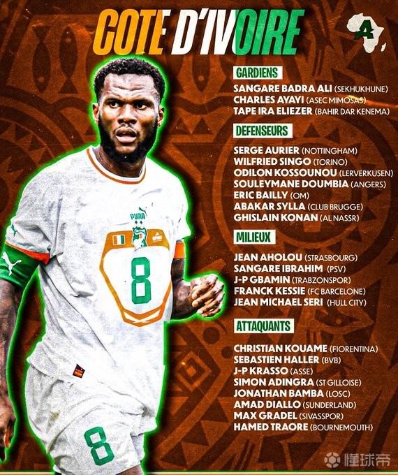 科特迪瓦大名单:凯西、阿莱领衔,拜利、奥里耶、阿马德在列