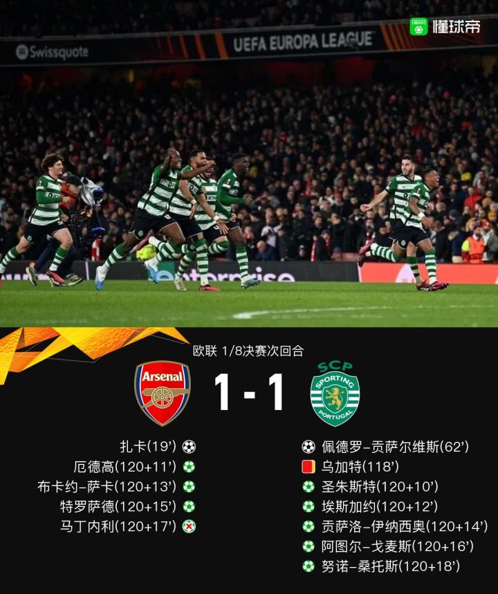 北京时间3月17日04:00,欧联1/8决赛次回合,阿森纳坐镇主场酋长球场迎战葡萄牙体育,本场主裁判为拉奥斯,首回合双方2-2战平。上半场,扎卡补射破门,富安健洋与萨利巴先后伤退。下半场,佩德罗-贡萨尔维斯惊天吊射扳平比分,拉姆斯代尔用脸挡出对方单刀,双方总比分战成3-3平进入加时赛。加时赛中,特罗萨德中柱,乌加特累计两黄被罚下。点球大战中,马丁内利主罚点球被扑,努诺-桑托斯罚入制胜点球。最终,阿森纳总比分3-3,点球大战3-5遭葡萄牙体育淘汰。